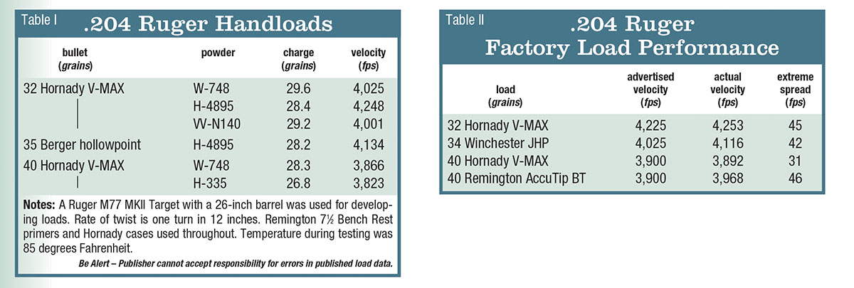A Ruger Model 77 MKII Target .204 Ruger with a 26-inch barrel was used to check velocities of factory loads.